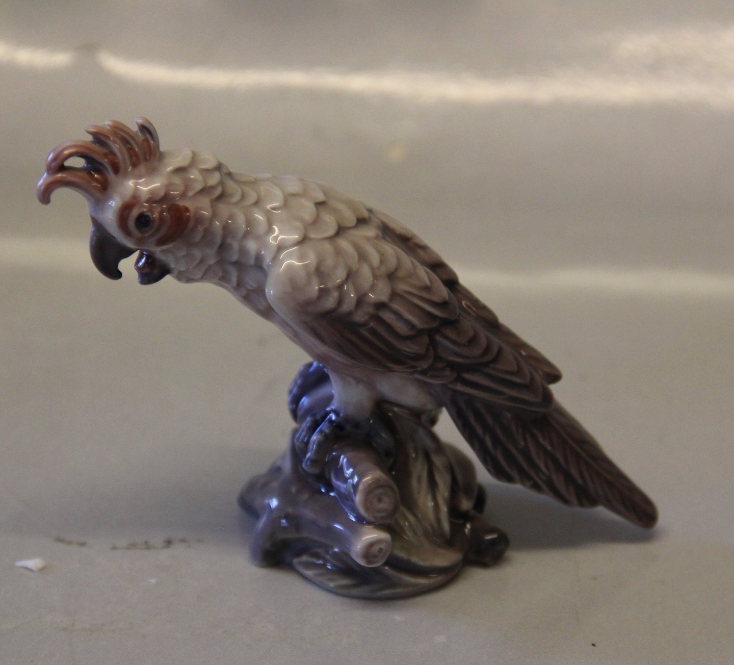 Beskrivelse: Dahl Jensen fugl 1316 Lille kakadue 11 cm (DJ). Mærket med kongelig krone og DJ Copenhagen i hel og fin stand.