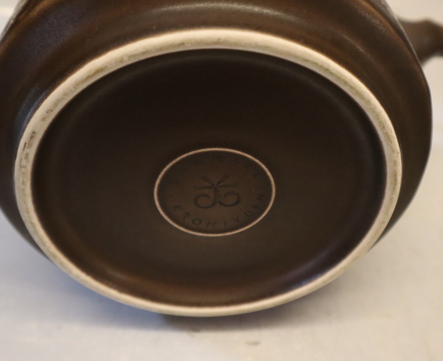 656 Tekande, stor 18 x 21.5 cm + basthank 1,5 l Umbra Brun Quistgaard Nissen Kronjyden stentøjsstel. I fin og hel stand. Stemplet Kronjyden eller Bing & Grondahl Copenhagen Stoneware: Designet for Kronjyden, Nissen B&G af Jens Harald Quistgaard IHQ