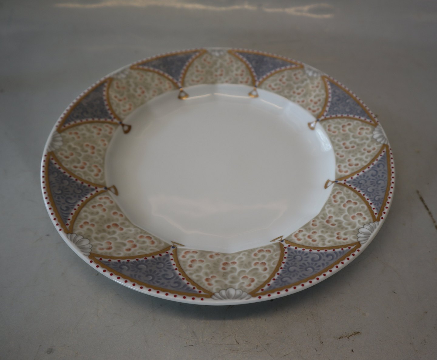 Grå 621 Frokosttallerkner 22,5 cm (8550) Royal Copenhagen Fairytale. Inspireret af Gerhard Hennings figurer af samme navn. Et kompleks flerfarvet transfer mønster på den kantede form som Blå Blomst Kantet. Design Finn Næss-Schmidt og Jørgen Nielsen. De grå dele har nummer 1201, terrakotta 1202 og serveringsdele med lidt af hvert 1203.